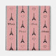 Ilustracion de París con Torre Eiffel y decoración del corazón y diseño de texto de París sobre fondo rayado negro, blanco y rosa