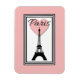 Ilustracion de París con Torre Eiffel y decoración cardíaca en rectángulos blancos y negros sobre fondo rosa