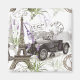 Hermoso arte vintage inspirado en París y con un coche retro, la Torre Eiffel, sellos vintage, teléfono retro y lavanda, todo en dos tonos. Elegante collage retro.