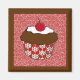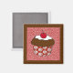 Magnet como un quequito de chocolate con espuma coronada con una cereza, con una envoltura decorativa de quequitos rojos y blancos, sobre un fondo con estampado rojizo y blanco