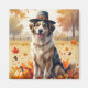 Una pintura acuarela de un perro alegre sentado en medio de un montón de hojas caídas vibrantes, rodeado de pequeñas calabazas y bellotas dispersas. El perro lleva un pequeño gorra peregrino y vigas de alegría, capturando el espíritu del Día de Acción de Gracias. Como telón de fondo, los campos de suave cosecha y los árboles de tonos dorados crean un ambiente campestre tranquilo. Las texturas suaves y los tonos cálidos y mudos del otoño le dan al lugar un ambiente acogedor y nostálgico, perfecto para celebrar la belleza de la temporada.