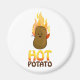 Patata marrón divertida con una cara feliz y llamas que salen de su mitad superior. Abajo están las palabras Patata Caliente.