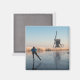 Imán fotográfico de recuerdo con una patineta de hielo en un río congelado pasado de cañas de enredadera y un molino de viento en una hermosa mañana de invierno en los Países Bajos.