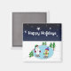 Digan 'fiestas felices' con este lindo muñeco de nieve y amigo patinando en un estanque en una noche estrellada.