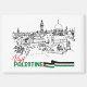 Los hogares palestinos tradicionales se mantienen orgullosamente, simbolizando el legado perdurable y la firme esperanza de regresar, con las palabras "Visita Palestina" desplegadas junto a la bandera palestina.