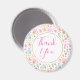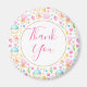 Un imán de agradecimiento con un patrón delicioso y caprichoso. Corazones, cartas de amor, muffins, tulipanes y cerezas traen alegría y felicidad a este lindo y pequeño patrón. colores pastel bonito. Un círculo blanco con un falso borde de Relieve metalizado dorado sobre la parte superior con tu texto dentro.