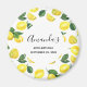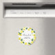Un imán de cumpleaños con un lindo patrón de limones amarillos con hojas verdes y rebanadas de limón recién cortado. Un círculo blanco se cubrió por encima con el texto dentro.
