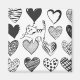 Gato juguetón colgando en un globo con forma de corazón rodeado de diferentes corazones con estampado en blanco y negro.