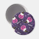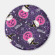 Un imán con un adorable patrón temático de Halloween. Gatos con gorras brujas, sentados sobre calabazas rosas con telarañas moradas en el fondo.