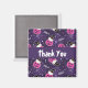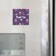 Un imán con un adorable patrón temático de Halloween. Gatos con gorras brujas, sentados sobre calabazas rosas con telarañas moradas en el fondo.