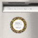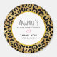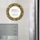 Un imán de agradecimiento para una fiesta de despedida de soltera con un patrón elegante. Manchas de leopardo negro exótico sobre un fondo dorado. Estilo salvaje y elegante. Superpuesto en la parte superior hay un marco circular blanco con un borde de foil dorado falso, con tu texto personalizado dentro.