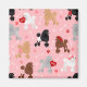 Poodles El día de San Valentín con abrigos de color negro, blanco, gris, albaricoque y marrón con un punto de polka rojo, rosa y blanco y sudadoras cardíacas con huellas de pata dispersas y flecha sobre un fondo rosado.