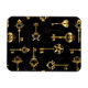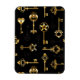 Patrón incomparable de llaves antiguas, doradas y de silueta sobre fondo negro.