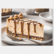 A piece of peanut butter cheesecake with peanuts and chocolate sauce on top.