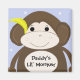Un mono lindo con una sonrisa grande y un plátano escondido en su oído. Fondo azul con puntos de polka blanco. El dicho "mono de papá' puede cambiarse como se desee.