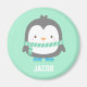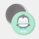 Un imán con un lindo pingüino con una bufanda de invierno de rayas verdes y un par de patines de hielo azules. Se puede cambiar el color de fondo de la menta. ¡Genial como un mini regalo o Navidades rellenando! Personaliza con el nombre del niño.