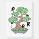 Simple ilustracion de un árbol bonsai machacado japonés en una bandeja superficial. Un grupo de diminutos ninjas hicieron de este árbol su base. Varios ninjas se esconden detrás del follaje. Una está colgando de una cuerda atada a una rama, otra está por encima del árbol atado a una cometa.