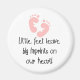 Las huellas de bebé rosadas y el texto negro que dice "¡Los pies pequeños dejan grandes huellas en nuestro corazón!" aparece en camisetas, tazas, bigotes, bolsos de té, botones y otros artículos, genial para cualquiera que espera a una niña o que ha tenido un chica de recién nacido.