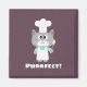 El gatito del chef es muy amable, con la palabra "perfecto" sobre un color de fondo morado berenjena.
