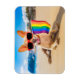 Esta linda foto muestra a un perro chihuahua en la playa llevando una bandera del Orgullo Gay de color arcoiris.