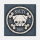 Emblema de cachorro de pug/bulldog y de pirata de huesos cruzados, en un borde de cuerda con anclas y letras de "Perro salado". Falsas grietas de edad angustiadas, camisetas, sudaderas, novedades, regalos.