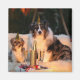 Design presenta una fotografía humorística de perros vestidos para celebrar Nochevieja. Están sentados en una manta peluda y llevan gorras fiestas. Una botella de champán está abierta delante de ellos.