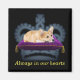 Un corgi triste sobre un cojín morado con borlas de oro, gráfico de una corona en el fondo, texto completamente personalizable