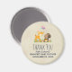 Un evento / fiesta gracias imán con un lindo ilustracion con un ciervo bebé y una pequeña ardilla sosteniendo una bellota y una mariposa volando sobre sus cabezas. Estas adorables criaturas de los bosques, paradas sobre un césped con unos extraños hongos a sus pies. Fondo es una imagen de papel parchment/kraft marrón claro.