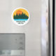 Hermoso imán familiar de vacaciones en el lago, con las aguas azul bonito bajo el bosque de árboles y la fresca puesta de sol naranja. Un buen recuerdo de viaje de camping para tu excursión a la naturaleza o grupo de salvajes.