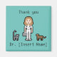Diseño de píxeles que representan a una veterinaria femenina, un gato de píxel y un perro de 8 bits. Hay campos para el texto de personalizable.
