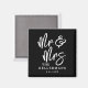 These custom magnets feature a simple black and white design with a clean black background and crisp white fonts for a timeless look. “Mr. & Mrs” appears in large handwritten script, paired with a classic serif font for a balanced and elegant style. At the bottom, the couple’s last name and wedding date are displayed for a meaningful finishing touch.