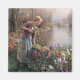 Este diseño presenta un cuadro del artista estadounidense Daniel Ridgway Knight (1839-1924). Muestra a una hermosa joven sosteniendo una barra de pesca de madera en su mano. Ella se está asomando al río para ver si ha pescado. Hay flores florecientes en colores brillantes a su alrededor. También hay algunos peces por sus pies que ya ha pescado. Es una atractiva escena de la vida tradicional y de la pesca de cosecha.