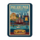 Philadelphia retro vector travel design. Philadelphia is one of America’s most historic cities, known for its Revolutionary-era landmarks, rich cultural heritage, and iconic foods. From Independence Hall to lively neighborhoods and museums, it blends deep history with modern urban energy.