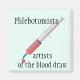 Jeringa y derramamiento de sangre con texto que dice Flebotomistas, artistas del sorteo de sangre.