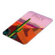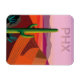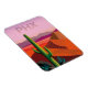 Este diseño es un poster contemporáneo con una simple expresión gráfica del paisaje desértico en rojo cálido, rosa y morado con cactus saguaro en primer plano. La abreviatura de texto "PHX" aparece en la parte superior del poster y "Arizona" en blanco pequeño en la parte inferior.