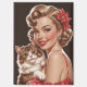 El ilustracion Smiling Pin-Up con Cat Portrait presenta a una mujer alegre con el pelo rubio y rizado adornado con un arco rojo, con un vestido rojo de flores con detalles escabrosos y un broche. Ella sostiene un gatito esponjoso de tabby con piel naranja y blanca y ojos verdes. Sus accesorios incluyen pendientes de piedras preciosas. El fondo es negro sólido, haciendo que los colores vibrantes de su vestido y el gato se vuelvan pop, creando un ambiente alegre y vintage de pin-up.
