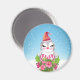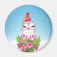 Un imán con un diseño tierno y caprichoso, con un pingüino adorable vestido con un sombrero rojo de santa. Detrás de un ramo de flores con caramelos de rayas rosas y blancas. Un invierno nevado con copos de nieve cayendo.