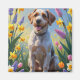 Un perro alegre se sienta tranquilamente sobre la exuberante hierba verde, rodeado de coloridas flores primaverales bajo un suave cielo azul. Esta pintura al óleo digital captura un momento sereno con pinceles expresivos, colores cálidos y un sentido de suavidad.