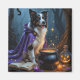 Entrar en una mágica noche de Halloween con esta pintoresca pintura al óleo con un adorable cachorro vestido con un mini manto de bruja, sentado al lado de un caldero burbujeante en un oscuro bosque. Rodeada de pociones brillantes, antiguos libros de ortografía y brillantes chispas mágicas, la escena está llena de misterio y encanto. Las ricas texturas de pintor y los profundos tonos de Halloween crean una acogedora atmósfera encantada perfecta para los amantes de la temporada espeluznante.