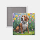 Un perro alegre se sienta tranquilamente sobre la exuberante hierba verde, rodeado de coloridas flores primaverales bajo un suave cielo azul. Esta pintura al óleo digital captura un momento sereno con pinceles expresivos, colores cálidos y un sentido de suavidad.