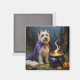 Entrar en una mágica noche de Halloween con esta pintoresca pintura al óleo con un adorable cachorro vestido con un mini manto de bruja, sentado al lado de un caldero burbujeante en un oscuro bosque. Rodeada de pociones brillantes, antiguos libros de ortografía y brillantes chispas mágicas, la escena está llena de misterio y encanto. Las ricas texturas de pintor y los profundos tonos de Halloween crean una acogedora atmósfera encantada perfecta para los amantes de la temporada espeluznante.