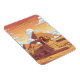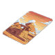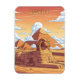 Un ilustracion estilizado de las Grandes Pirámides de Giza y la Esfinge bajo un cielo naranja vibrante y nublado, que evoca un sentido de maravilla antigua.