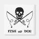 El cráneo clásico de Jolly Roger y los cruces, pero con postes de pesca cruzados. Leyenda: "¡Peces o mueres!".