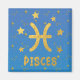 imán personalizado para "Pisces" con símbolo zodiaco dorado y estrellas doradas, con fondo degradado azul.