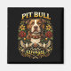 Una audaz ilustración ornamental de un pit bull rodeado de rosas y palomas, que simboliza la lealtad, la compasión y la fuerza mal entendida de la raza.
