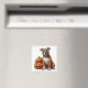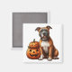 Un detallado ilustracion de un perro de pitbull sentado junto a calabazas talladas de Halloween, mostrando un tema festivo y juguetón de Halloween