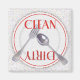 Este imán de lavavajillas tiene un ilustracion de un plato blanco con una raya roja y un borde rojo texturado, y fotos de un tenedor y cuchara en el plato. El plato se sienta sobre un fondo gris texturado que parece granito. Dice CLEAN en rojo en un lado del plato, con la palabra DIRTY, en letras rojas "sucias", en el otro lado.