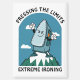 Un dibujo divertido de una plancha de dibujos animados con una cara determinada y brazos y piernas de pie en la parte superior de una montaña verde con nieve blanca. Detrás de él hay nubes blancas esponjosas en un cielo azul. Arriba y debajo de la imagen se lee 'Presionando Los Límites' y 'Planchado Extremo'. en texto negro. Ambos son plantillas para que los use tal como están o los reemplace con su propio texto si lo desea. O elimine las palabras para dejar en blanco.