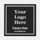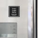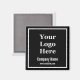 En la parte superior, hay una imagen que puede ser reemplazada por el logo de su empresa. Bajo el logotipo, hay dos líneas de texto en blanco que se pueden editar para crear un mensaje personalizado. (Muestra: Nombre de la empresa, sitio web). El imán es negro. El imán tiene un borde blanco.