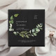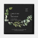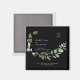 Boda de acuarela botánica moderna Salva la fecha. Cuadrada. Texto blanco. Imán. Fondo negro.